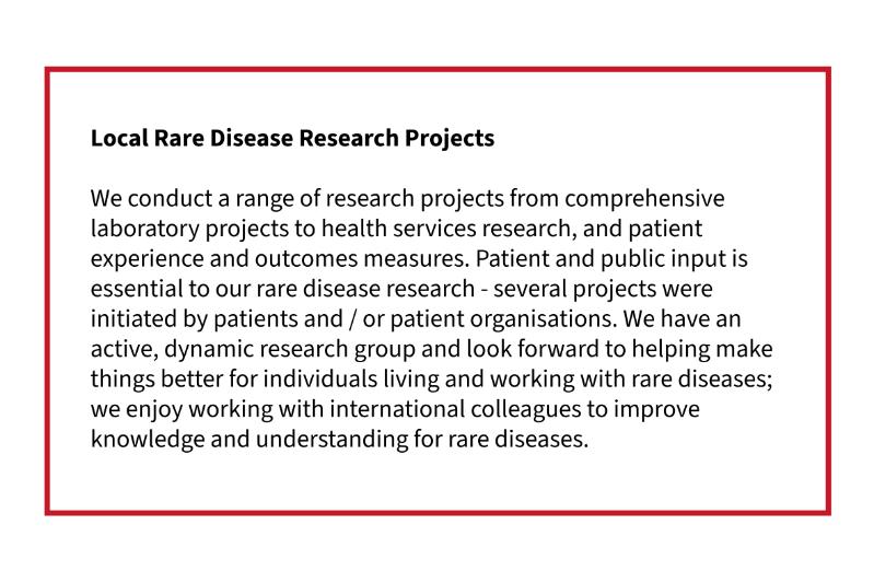 We conduct a range of research projects from comprehensive laboratory projects to health services research, and patient experience and outcomes measures. Patient and public input is essential to our rare disease research - several projects were initiated by patients and / or patient organisations. We have an active, dynamic research group and look forward to helping make things better for individuals living and working with rare diseases; we enjoy working with international colleagues to improve knowledge and understanding for rare diseases.