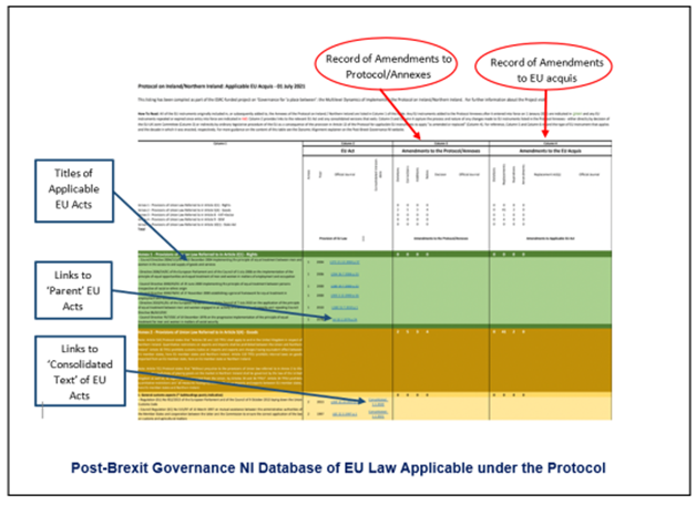 To this end, it has developed a freely accessible database that provides links to each applicable EU act as well as relevant implementing acts adopted by the EU that can be found through the ‘consolidated text’ versions of the original acts; any additions, amendments, or replacements as well as the deletions and instances where, through expiry, an EU act no longer applies are also recorded. The database contains a list of all of those EU acts that apply in the UK ‘in respect of Northern Ireland’ through the Protocol as of 1 July 2022. It therefore reflects all of the ‘amendments and replacements’ to applicable EU law described in this explainer.